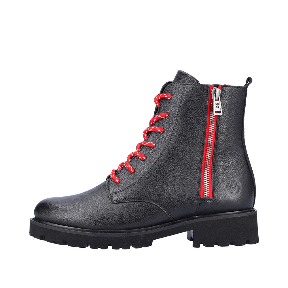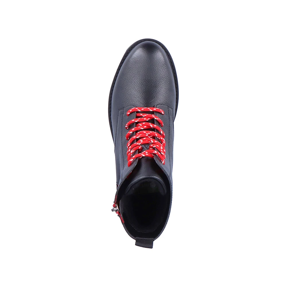 These leather high ankle boots will add playfulness and a touch of originality to your outfit, thanks to red laces and a zipper on the outside. And if the red laces don’t suit your outfit, they can easily be replaced with black ones. The autumn-winter footwear is covered in smooth black leather, which is a guarantee of quality, and has a memory insole and a light sole for maximum walking comfort. The warm inner lining will protect you from the cold. This perfect model should not be missing in your shoebox!