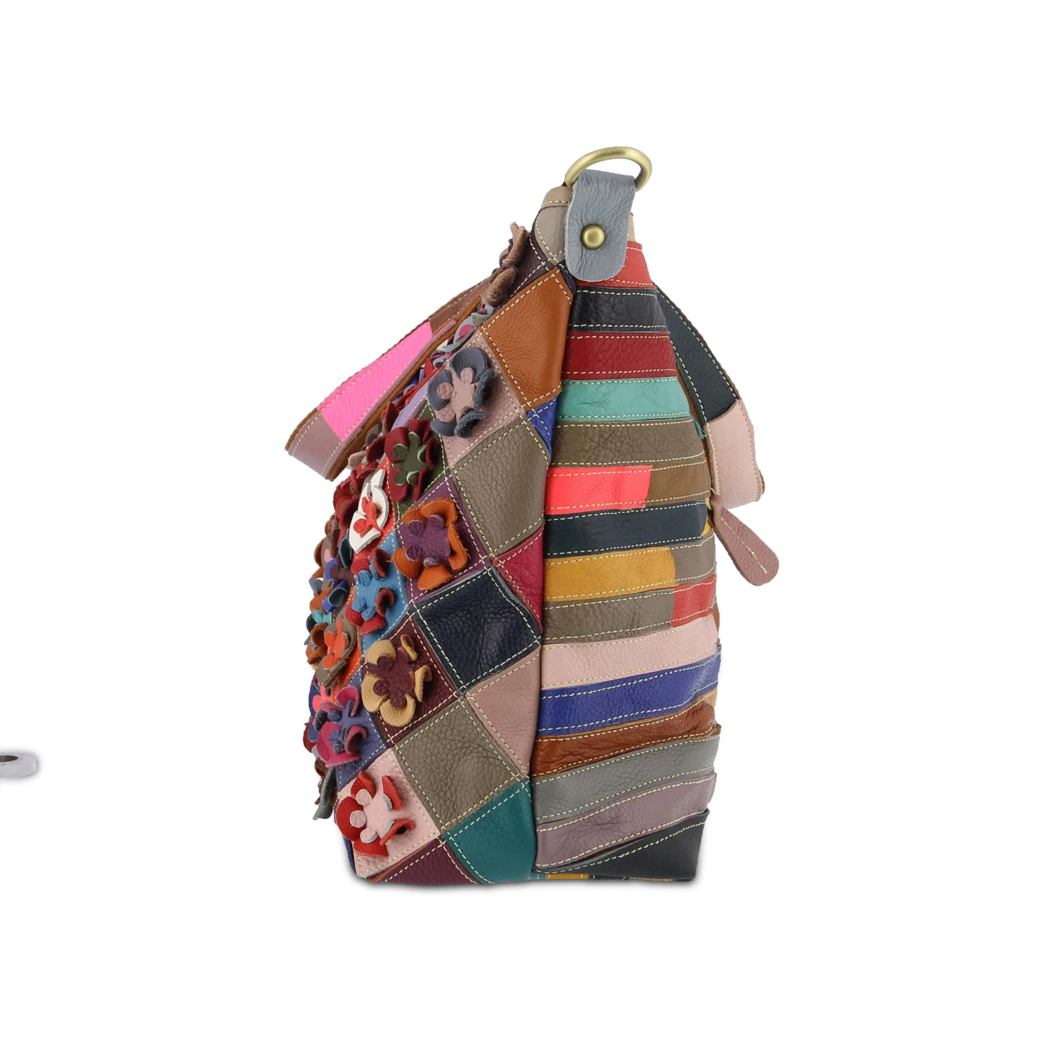 No two totes alike! Colors galore grace the front of your forever blossoming leather flower garden. Wear it to the front to show your love of nature- turn it around for a hand stitched kaleidoscope quilt with center safe keeping zipper pocket. Solid color leather and canvas backed shoulder straps, with detachable/adjustable multi colored leather and canvas cross body strap. Large single interior compartment with 3 wall pouches and double zip wall pockets.