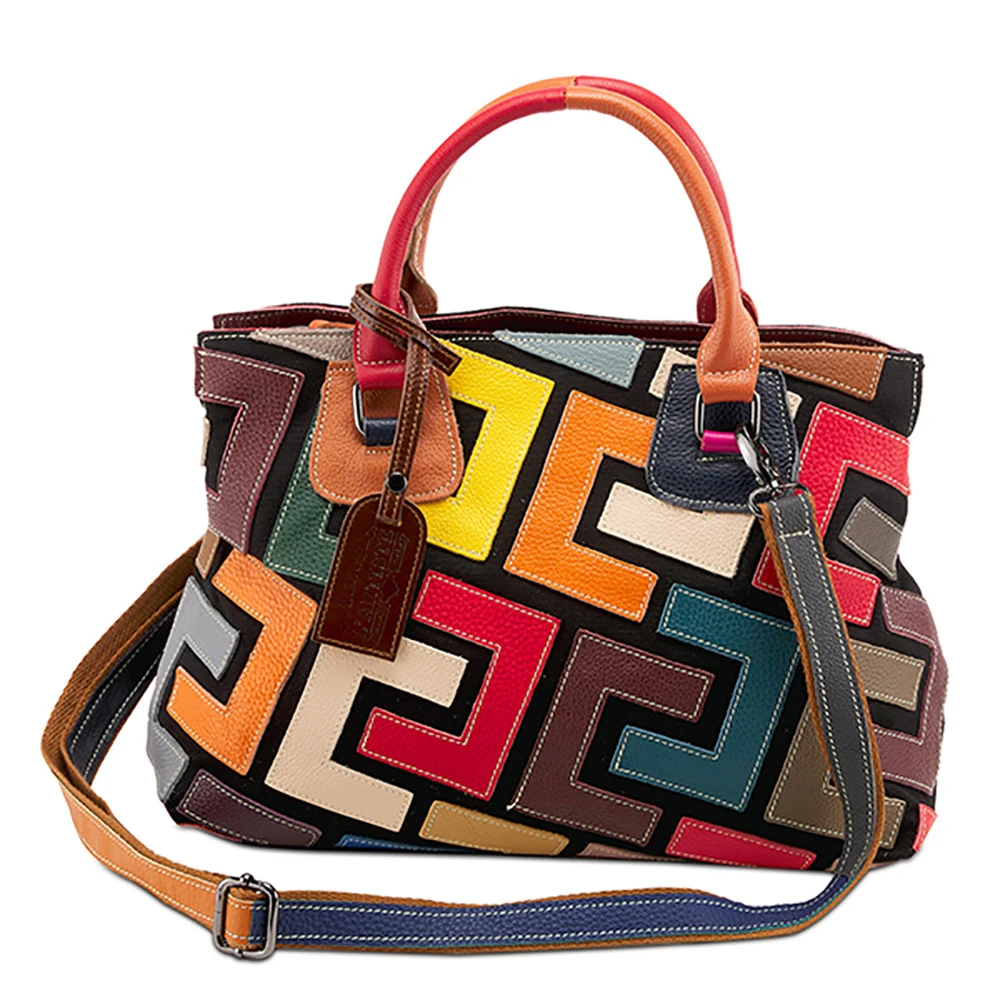 Multi colored pebble Leathers adorn both the front and back of this zip-top tote boasting either alternating and interlocking triple sided block designs or soft floating smooth boulders on pitch black cotton canvas. Leather rolled multi colored handles with adjustable detachable Leather and canvas shoulder strap and an outside central back zipper. Inside features two compartments with alternating zip and open wall pouches.
